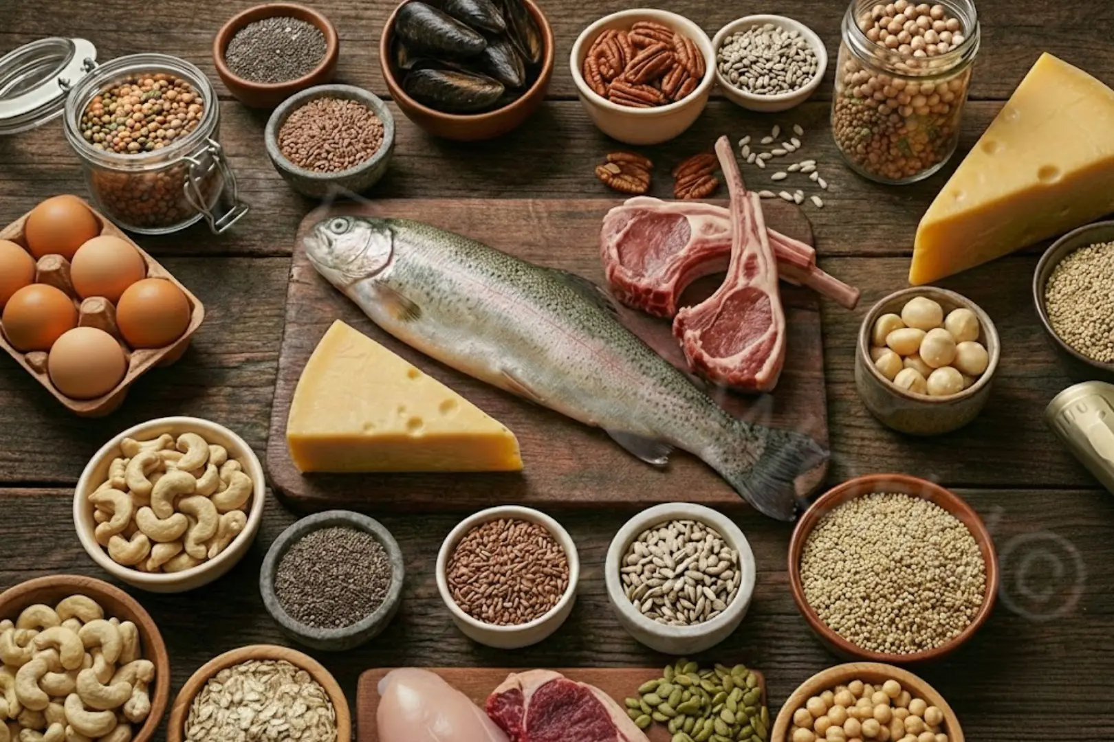 Chicken breast, fish (salmon, tuna), eggs, lean steak, shrimp, lobster, lentils, chickpeas, kidney beans, and tofu. Vegetables like broccoli, spinach, and peas support protein intake and digestion.